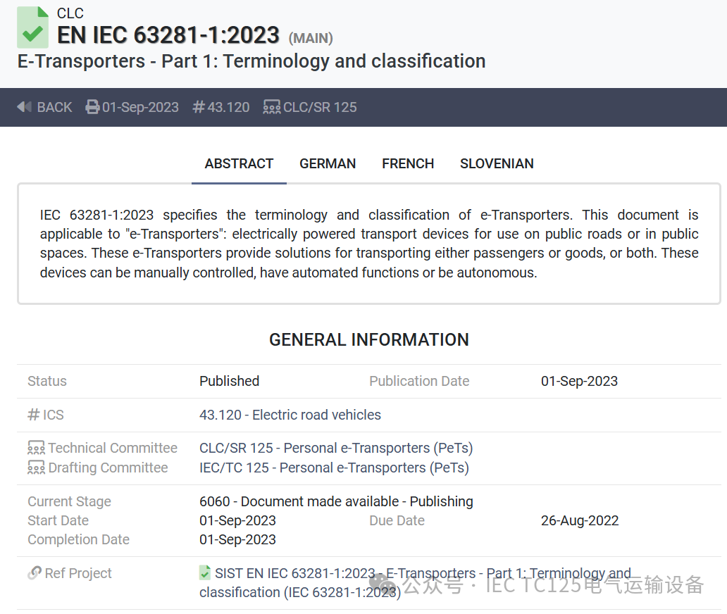 在全球化浪潮下,标准的统一与协调对于行业的可持续发展具有深远意义。IEC/TC125 四项标准的发布,为电气运输设备这一新兴品类提供了清晰的术语定义和明确的技术规范、测试方法,保障了产品的安全和质量。后续,在 IEC/TC125 标准的引领下,电气运输设备将打破地域壁垒,加速全球市场的融合与流通,促进产业链上下游的高效协同,激发企业的创新活力,推动技术不断迭代升级 ,以更卓越的性能、更环保的理念、更智能的特性,开启全球绿色交通、智慧物流的行业发展崭新篇章。