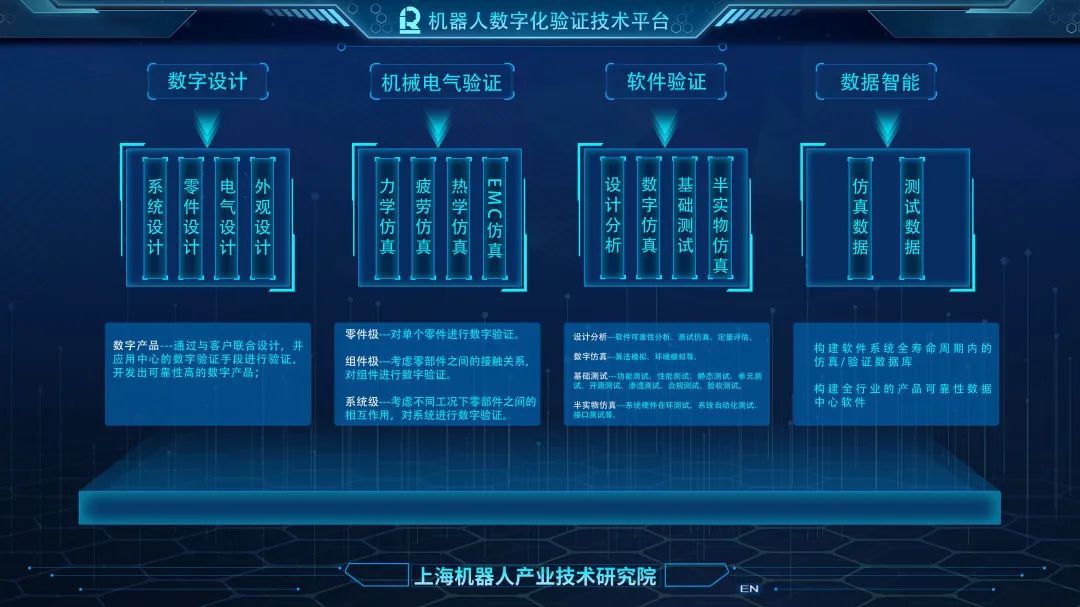 机器人数字设计验证中心(图5)是上海市机器人研发与转化功能型平台打造的三大技术服务平台之一,针对各类机器人研发需求建立了丰富的数字设计能力(图6)、数字验证能力(图7)以及可共享的软硬件平台(图8),并已开放对外服务。