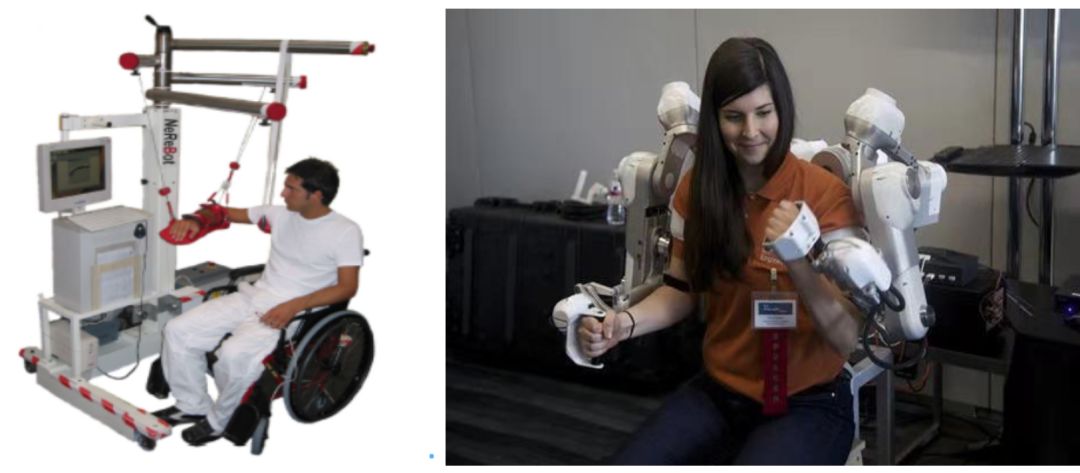 双臂康复机器人主要分为两种,一种是末端牵引式机器人,一种是外骨骼式机器人。早期研究的上肢康复设备是基于末端效应机器人设计,它是通过牵引病人的手或前臂的一个点进行训练,外骨骼机器人通常具有类似于人的肢体的运动结构,为患肢提供重力补偿,具有多个自由度,可以协助患者上肢关节进行复合运动。它不但可以实现高强度,高稳定的重复式训练,而且能够精确的保证训练效率和强度。