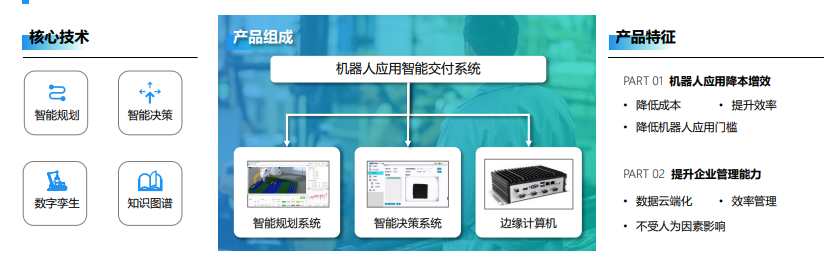 在工业4.0智能制造时代背景下,摩马智能科技有限公司专注于工业机器人智能化、柔性化升级,由其研发的机器人应用智能交付系统是一套成功应用于工业机器人无人化部署的软硬件产品,该产品有效解决了工业机器人应用全生命周期中各环节割裂的痛点,从最初的需求收集、方案设计,到最终的执行生产、换产、增产,通过全集成智能规划决策的方式,将各个环节紧密相连,显著提升了工业机器人产业协同性及应用效率,有效的降低了工业机器人应用成本。